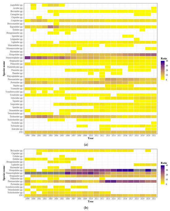 Following the analysis of the major fish species caught in the waters surrounding Korea from 1999 to 2021, the dominant species in the entire waters was noted as Octopodidae spp., which has demonstrated a steady increase since 2004 (Figure 6a). Conversely, the opposite trend was shown by Ommastrephidae spp., which accounted for approximately 30–40% of the total catches between 1999 and 2006, but showed a gradual decrease (Figure 6a). In addition, the species that were caught previously but are currently rarely caught are Clupeidae spp., Gadidae spp., Hexagrammidae spp., and Trichodontidae spp.; meanwhile, the species that were not previously dominant but are presently gradually entering the catch ratio ranking are Sebastidae spp., Sepiidae spp., and Sparidae spp. (Figure 6a).