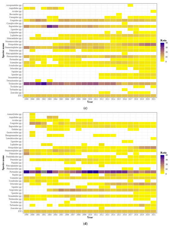 In the East Sea, Octopodidae spp. and Pleuronectidae spp. were the species that exhibited an increasing catch ratio. In contrast, Clupeidae spp., Gadidae spp., Hexagrammidae spp., Trichodontidae spp., and Scomberesocidae spp. were found to have been rarely caught recently (Figure 6b). In the South Sea, Octopodidae spp. showed an increasing catch ratio until recently, and although the catch ratio in each sea area varied by year, Congridae spp., Engraulidae spp., Trichiuridae spp., and Pleuronectidae spp. maintained a relatively constant dominant ratio (Figure 6c). In the West Sea, there was an increase and decrease by year, but Portunidae spp. had the highest catch rate, and Sebastidae spp. and Ocotopodidae spp. had high catch rates over the past 5 years (Figure 6d). In addition, species that were caught previously but have not been caught recently included Arcidae spp. and Hexagrammidae spp. (Figure 6d).