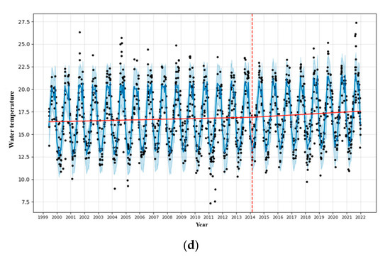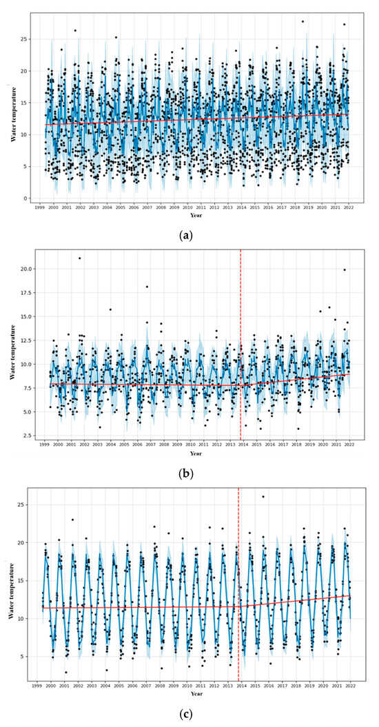 The changes in waters around the Korean Peninsula showed a trend toward rising water temperatures, as shown in Figure 7a. However, there was no point in which changes occurred before or after a specific time. Next, the characteristics of these water temperature changes and change points by sea area were distinguished. The East Sea changed on 20 October 2013, the West Sea on 15 October 2013, and the South Sea on 25 February 2014 (Figure 7b,c).