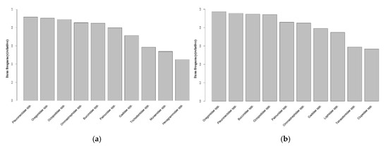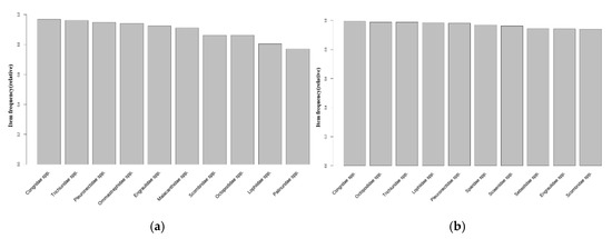 The frequency in which the top 10 species were caught in the transactions in the South Sea: (a) before the water temperature change point (25 February 2014); (b) after the water temperature change point (25 February 2014).