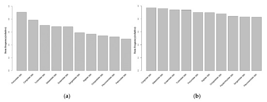 The frequency in which the top 10 species were caught in the transactions in the East Sea: (a) before the water temperature changing point (20 October 2013); (b) after the water temperature changing point (20 October 2013).
