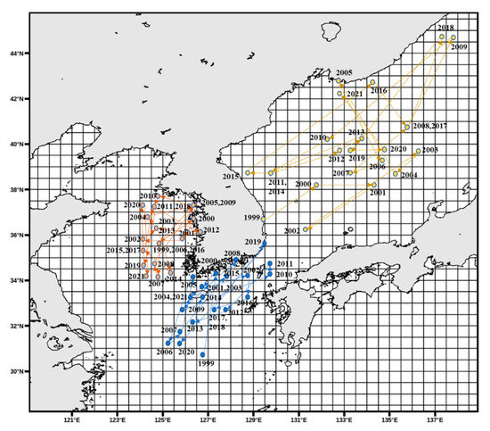 We used the spatiotemporal fishing activity data (from June 1999 to December 2021) maintained by the National Federation of Fisheries Cooperatives Safety Operation Headquarters. These are data obtained by fishermen reporting their fishing activities every 12 h after departure (Table 1). The CAR (Catching Activity Record) data do not disclose the fishing vessel number, which is personal information that can distinguish fishing activities. For these reasons, this study aimed to analyze spatiotemporal fishing patterns based on the names of the fish caught based on the temporal information of ‘fishing date’ and the spatial information of ‘large sea area’. The total number of records reported for 8248 days was 15,249,614.
