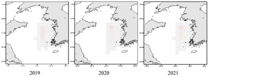 Similarly, as seen in Figure 11, from 1999 to the early 2000s, CPUE density was concentrated around latitude 34–35° N and longitude 129–130° E, although it remained lower than that of the West Sea. Additionally, the Todarodes pacificus fishing grounds in the South Sea showed a gradual contraction toward coastal waters.