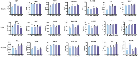 As depicted in Figure 1, the NC exhibited significant reductions in serum T-SOD and CuZn-SOD activities compared with the HIMT, as well as hepatic MDA content, T-SOD, and CuZn-SOD activities (p < 0.05). Additionally, a decreasing trend was observed in serum CAT activity (p = 0.083). Both the NC and the LITM displayed a markable reduction of muscle CuZn-SOD activity compared with the HIMT (p < 0.05), whereas the LOTM showed no statistically significant alteration (p > 0.05). Notably, the LOTM demonstrated significantly higher activities of serum GSH-Px, hepatic T-SOD and CuZn-SOD, muscle CuZn-SOD, and CAT (p < 0.05) compared with the LITM. Furthermore, a significant reduction in hepatic MDA content was also observed in the LOTM compared with HITM and LITM (p < 0.05).
