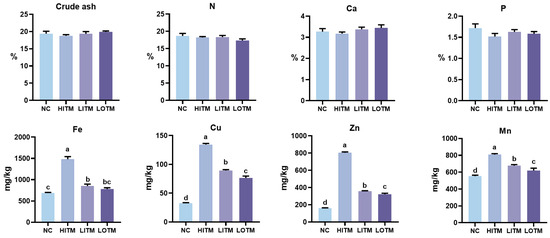 As illustrated in Figure 2, all treatments had no effect on the fecal emissions of crude ash, nitrogen, calcium, or phosphorus (p > 0.05). The fecal excretion levels of Fe, Cu, Zn, and Mn were significantly decreased in both the NC and the low-dose treatment groups compared with the HITM (p < 0.05). Furthermore, the fecal excretion of Cu, Zn, and Mn in the LOTM was significantly lower than that in the LITM, with reductions of 14.34%, 10.15%, and 8.70%, respectively (p < 0.05).