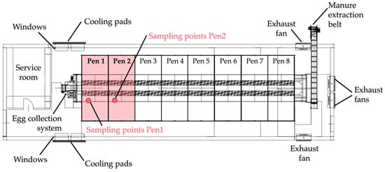 Schematic layout of hen barn and aviary system and sampling points for environmental monitoring.