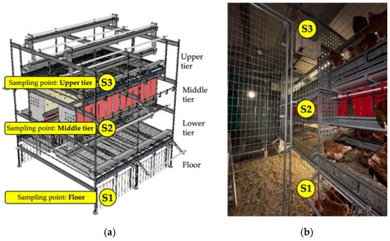 To capture the environmental conditions at different levels of the aviary, sensors were placed at three specific heights: the ground floor (S1: 0.1 m above the floor), the second tier (S2: 1.8 m above the floor), and the third tier (S3: 2.7 m above the floor) (Figure 2 and Figure 4).