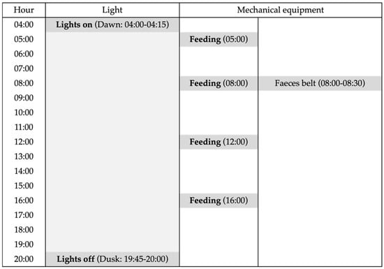 The aviary system operated on a consistent daily schedule for lighting and mechanical equipment (Figure 3). The lighting regime simulated the natural dawn and dusk, with lights turning on gradually between 04:00 and 04:15 (dawn) and off between 19:45 and 20:00 (dusk), providing 16 h of light per day. Mechanical operations included four feeding cycles and one faeces belt operation per day. Feed distribution automatically started and occurred at 05:00, 08:00, 12:00, and 16:00 h. The faeces belt operated once daily from 08:00 to 08:30, coinciding with the second feed distribution.