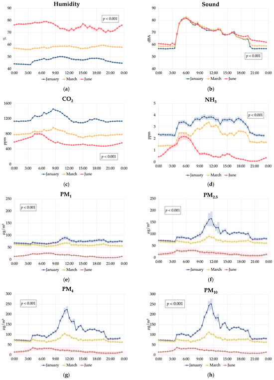 Effect of the interaction between the hour of the day and the sampling cycle (January, March, and June) on the environmental conditions in a cage-free multi-tiered aviary system: (a) humidity; (b) sound; (c) carbon dioxide (CO2); (d) ammonia (NH3); (e) particulate matter PM1; (f) particulate matter PM2.5; (g) particulate matter PM4; and (h) particulate matter PM10.