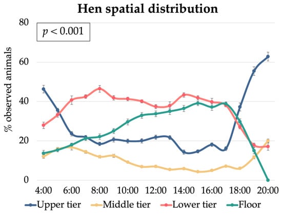 The distribution of the laying hens across the different tiers of the cage-free aviary system varied significantly throughout the day (p < 0.001) (Figure 6).
