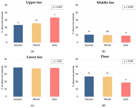 Effect of the month of sampling on laying hen distribution (% of observed animals) within a multi-tiered aviary system: (a) upper tier; (b) middle tier; (c) lower tier; and (d) floor. Different letters above bars indicate statistically significant differences between means (p < 0.05).