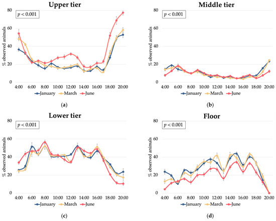 Effect of the interaction between the hour of day and the month of sampling on laying hen distribution (% of observed animals) within a multi-tiered aviary system: (a) upper tier; (b) middle tier; (c) lower tier; and (d) floor.