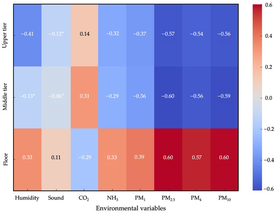 Correlation between the hen spatial distribution (% of observed hens) and environmental variables at different tiers (upper tier, middle tier) and on the floor of a cage-free aviary system. * p > 0.05.