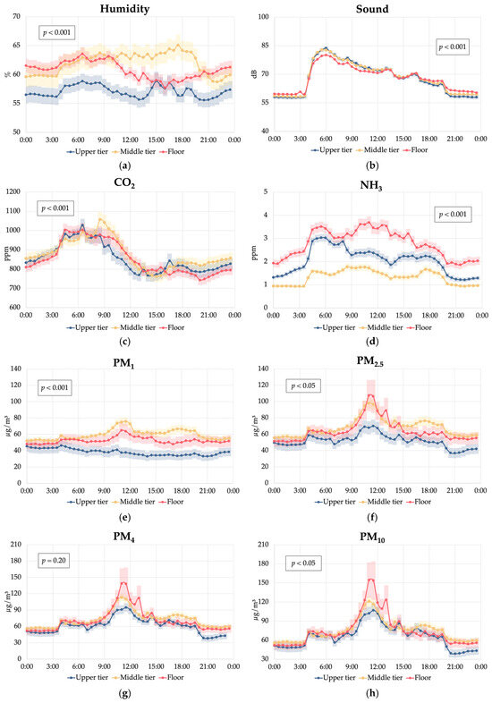 Effect of the interaction between the hour of the day and the tier height (upper tier, middle tier, or floor) on the environmental conditions in a cage-free multi-tiered aviary system: (a) humidity; (b) sound; (c) carbon dioxide (CO2); (d) ammonia (NH3); (e) particulate matter PM1; (f) particulate matter PM2.5; (g) particulate matter PM4; and (h) particulate matter PM10.