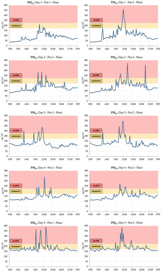 Focusing on PM2.5 levels on the floor during the winter period, which represented the most critical scenario observed in this study, we identified an “ALARM” zone above 230 μg/m3, a concentration considered potentially harmful for livestock [49]. Additionally, a “WARNING” zone was established between 180 and 230 μg/m3, indicating the need for preventive measures to avoid further PM accumulation (Figure 11).