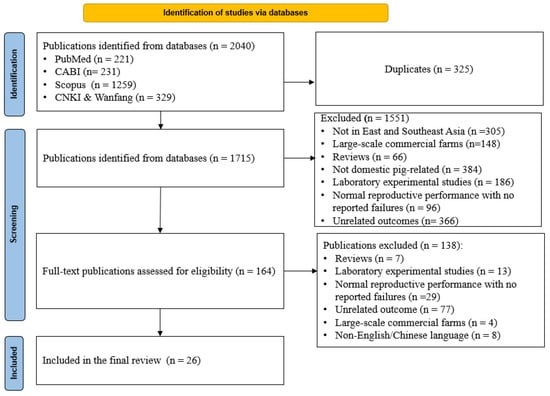 Studies that met the following criteria were included in our final synthesis: (1) published in peer-reviewed journals, (2) full text available in English or Chinese, (3) investigated pig reproductive failures or associated factors in smallholder farms (including studies that either did not specify the farm scale or included both smallholder and large-scale farms, with special focus on smallholders), and (4) conducted in East or Southeast Asian countries (i.e., Brunei, Cambodia, China, Hong Kong SAR, Indonesia, Japan, Lao PDR, Macau, Malaysia, Mongolia, Myanmar, North Korea, the Philippines, Singapore, South Korea, Taiwan, Thailand, Timor-Leste, and Vietnam [33,34]. Studies were excluded if they (1) were conducted in medium- or large-scale production systems, (2) were conducted on species other than domesticated pigs (Sus scrofa domestcus), (3) were laboratory experiments, (4) reported reproductive performance in normal circumstances (i.e., no reproductive issues/failure reported), or (5) were review articles and grey literature.