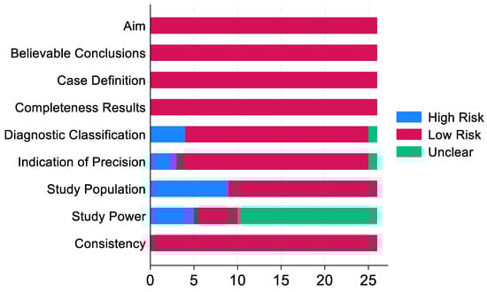 Frequency distribution of 26 systematically reviewed studies categorised as having high, low, or unclear risk of bias by each domain; the framework was adapted from Karalliu et al. [62].