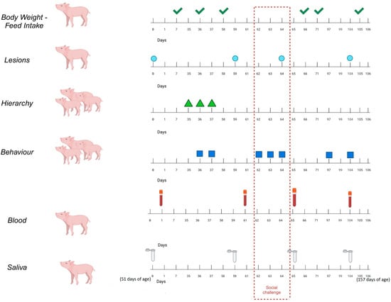 From days 97 to 106, the parameters of the pre-slaughter period were assessed. On day 104, the lesions of all the animals were assessed. On day 104, saliva samples were taken from the 18 focal animals; on day 105, all the pigs were individually weighed; and on day 106, blood samples were extracted from the 18 focal animals.
