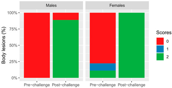 Stacked bar chart showing the different body lesion scores (0 = fewer than 15 scratches, open wounds, or wounds with blood; 1 = 15 or more scratches with fewer than one/only one open wound or a wound with blood; 2 = 15 or more scratches with more than one open wound or wound with blood). Pre-challenge: males (0: 100%), females (0: 77.77%; 1: 11.11%; 2: 11.11%). Post-challenge: males (0: 11.11%; 2: 88.88%), females (2: 100%).