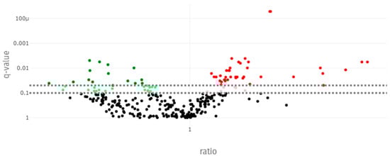 Volcano plot representing q values and ratios of metabolite concentrations during the pre-challenge and post-challenge periods. Green indicates a ratio below 1, red indicates a ratio above 1.