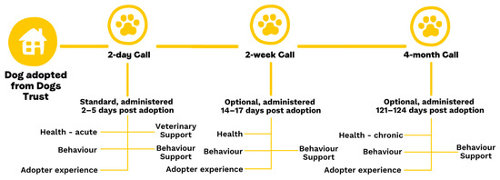 The Post Adoption Support project was launched on 1 April 2018 for dogs rehomed to the public across all UK Dogs Trust Rehoming Centres. At the time of adoption, adopters are asked to sign a consent form for follow-up calls. A single post-adoption follow-up call, scheduled at a 2-day timepoint after rehoming, is offered as a default for all adopters as part of the terms and conditions of adoption (though it can be opted out of, if requested). Participants are also able to opt in to two additional calls, scheduled at a 2-week and 4-month timepoint post-adoption. This consent is stored digitally in a Customer Relationship Management (CRM) system (Salesforce), and consent is then re-confirmed at the start of each call. Participants can opt out of any call at any time.