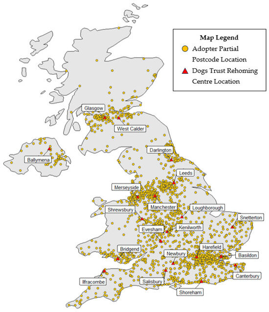 Geographical distributions of adopters (n = 5495) and Dogs Trust Rehoming Centre locations (n = 20) in the UK.