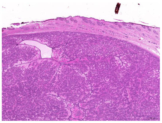 Figure 2. Trichoblastoma. Neoplastic cells are arranged in trabeculae (scale bar = 500 µm). Hematoxylin and eosin staining.