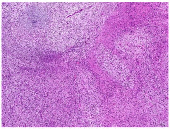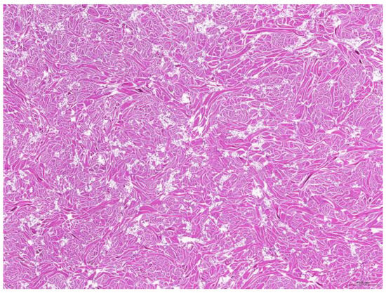 Of the 85 biopsy samples, the most commonly affected system was the integumentary system (48.2%, 41/85), followed by the reproductive system (42.4%, 36/85), the digestive system (8.2%, 7/85), and the urinary system (1.2%, 1/85) (Table 3). Of the 41 rabbits with an affected integumentary system, 39 had neoplastic and two had non-neoplastic disorders. The median age of these affected rabbits was 87 (12–149) months. There were 15 females and 26 males, with a female-to-male ratio of 0.54:1. The most common integumentary diagnosis was fibrosarcoma (29.3%, 12/41) (Figure 1), followed by trichoblastoma (19.5%, 8/41) (Figure 2), fibroma (9.8%, 4/41) (Figure 3), lipoma (7.3%, 3/41), mammary gland adenoma (7.3%, 3/41), and mammary gland adenocarcinoma (4.9%, 2/41) (Figure 4), among others. The median age of the rabbits with fibrosarcomas was 108 (54–126) months. Of the 12 cases with fibrosarcoma, 4 were females and 8 were males, with a female-to-male ratio of 0.5:1. The tumors were located on the neck, chest, abdomen, and extremities. The median age of the rabbits with fibromas was 101 (48–108) months. All four of these were males, with tumors exclusively located on the chest. Myxosarcoma was diagnosed in a 108-month-old male rabbit, with the tumor located on the left elbow (Figure 5).