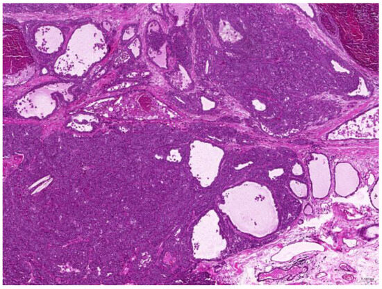 In pet rabbits, mammary gland tumors are common in females over 2 years old [13]. These are most often adenocarcinoma, which is likely associated with uterine hyperplasia and hyperestrogenism [11,13,21]. Of the organ systems, the female reproductive tract, particularly the uterus, is the most commonly affected [11,12]. Spaying female rabbits before they reach 6 months is advised to prevent uterine and mammary tumors [13]. In our study, 32 of the diagnoses, obtained from 22 intact animals, affected the female reproductive tract. This supports the aforementioned recommendation, further indicating that neutering is essential for prevention. Common neoplastic and non-neoplastic lesions in the uterus include uterine adenocarcinoma, endometrial hyperplasia, carcinosarcoma, and adenomyosis [12]. In our study, the most common diagnoses were uterine adenocarcinoma (50%), followed by endometrial cystic hyperplasia (15.6%) and uterine adenomyosis (12.5%). Uterine adenocarcinoma has previously been shown to affect 50–80% of female rabbits older than 3 years [13]. The median age of affected females with uterine adenocarcinoma in our study was 82 (42–132) months (6.8 years). It is likely that the prevalence of uterine adenocarcinoma is underestimated in our study, as these tumors are often diagnosed clinically or result in euthanasia without histological confirmation.