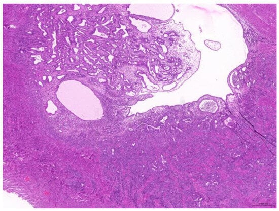 Thirty-six biopsy specimens were taken from the reproductive systems of 22 females and two males (a female-to-male ratio of 11:1). All of the females were intact, and 32 diagnoses were obtained from these 22 females. The median age of the affected females was 71 (20–132) months. The most common diagnoses were uterine adenocarcinoma (50%, 16/32) (Figure 6), followed by endometrial cystic hyperplasia (15.6%, 5/32), uterine adenomyosis (12.5%, 4/32), uterine leiomyoma (6.25%, 2/32), and luteoma (6.25%, 2/32). The median age of the females with uterine adenocarcinoma was 82 (42–132) months. From the two male rabbits, four diagnoses affecting the reproductive system were obtained. Both of these males were intact. The median age of the affected males was 113.5 (109–118) months. The most common diagnosis was interstitial cell tumor (50%, 2/4), followed by seminoma (25%, 1/4) and testicular atrophy (25%, 1/4).