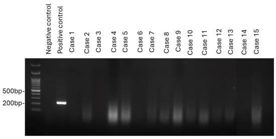 The PCR reaction mixture consisted of 10 μL of Phire Green Hot Start II PCR Master Mix (Thermo ScientificTM, Waltham, MA, USA), 1 μL of forward primer, 1 μL of reverse primer, and ultrapure distilled water (DNase- and RNase-free). Sample tubes containing 2 μL each of DNA extracted from the tumor specimens were prepared. The negative controls included only the reaction mixture, while the positive control contained 1 μL of the synthesized genomic DNA. The sequence of the synthesized genomic DNA was gcaccaaaaactcatataacttctagccgtggaggcatttgcgatgaaccgggacacatcgaacgagataagtatatgttccaacagatgtgccgtacccagtatacctcctatgtccttttcgaatccgaacccagaaatccctacgtatatatctttgttcgtggaagtgtttataaatacacgcaccccgttatcgaatacaatcatttactaaggagtaaaatagg.