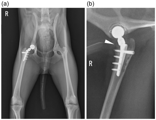 Postoperative radiographs after first total hip replacement surgery (right hip). (a) Ventrodorsal view; (b) yoga view: the stem was placed slightly proximally, as indicated by the arrowhead.