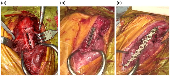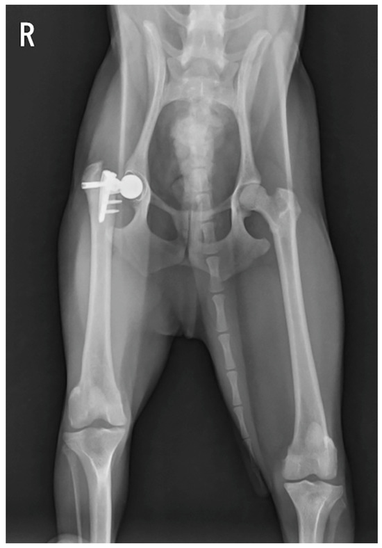 The patient was a 2.8 kg, 1 year and 1 month old, neutered, male Toy Poodle. THR of the right hindlimb was performed for Legg–Calvé–Perthes disease. The Zurich mini-cementless total hip system was used for hip replacement. In this case, a size XS stem (3 mm wide) and size S neck made of Ti6Al7Nb titanium alloy were placed in the femur and an 11 mm cup of CFR-PEEK with a Ti/HA coating was placed in the acetabulum. The surgical procedure was performed as described in previous reports [20]. Postoperative radiographic examination revealed that the size and position of the implants were generally appropriate, except for the slightly proximal placement of the stem (Figure 1). The cup lateral opening, cup retroversion, and stem anteversion angles were 48°, 20°, and 23°, respectively. Lameness resolved 20 days postoperatively and rehabilitation was not required. Confinement in a restricted-space environment with non-slip flooring was required for 2 months. Leash-walking was allowed, while off-leash activity was not permitted (no running, jumping, or playing with other dogs). After clinical and radiographic re-examination 2 months after surgery, regular free activity was gradually permitted in the following month. Postoperative radiographs were taken at 2, 4, 8, and 12 weeks, followed by every 3 months until 1 postoperative year. On postoperative day 172, the patient presented with acute right-hind-limb lameness, and a radiographic examination was performed on postoperative day 176, which revealed a fracture of the peg portion of the stem (Figure 2). A second surgery was performed 1 month later. When the stem was reinstalled, general anesthesia was induced with propofol (4 mg/kg intravenously [IV]) and fentanyl (10 µg/kg IV) and maintained with isoflurane after endotracheal intubation. Analgesia was achieved through a constant-rate infusion of fentanyl (5–20 µg/kg/h). Ceftazidime (25 mg/kg IV) was administered 1 hour before the surgery and repeated every 2 h. After aseptic preparation, the approach was first performed from the anterolateral side of the femoral greater trochanter, and the joint was incised to confirm the fracture site. As the stem was firmly osseintegrated to the femur and impossible to pull out, a window was created using a high-speed bur and oscillating saw to separate the outer cortex into a rectangular shape approximately 3 mm wide, the same width as the stem, using a recently placed bicortical screw as a landmark to expose the outer part of the stem (Figure 3a). Since the stem was osseintegrated, it was removed via milling using a high-speed bur. This was performed with great care to avoid damage to the medial cortex of the femur.