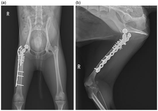 After stem removal, the femoral canal was reamed with a rasp to allow for the insertion of the SN stem with a proximal width of 3.9 mm and distal width of 2.8 mm, which can accommodate a body weight of up to 6 kg. A new stem was then placed to avoid the screw hole from the first surgery (Figure 3b). The bone fragment was placed back in the window and temporarily fixed with a 22 G stainless steel wire. A titanium plate was then placed externally from the femoral greater trochanter to the femoral diaphysis, and a cerclage wire was made with a 22 G stainless steel wire to secure the detached bone fragments (Figure 3c). The gap between the created window and the bone fragments was filled using bone allograft (Fortigen-p; Progenica, Duleek, Ireland). The hip joint was then repositioned after a new stem was attached to a size S neck and an 8 mm head. The surgical field was cleaned, sutured, and closed. Bacterial cultures performed around the implants at the beginning and end of the second surgery were negative. Postoperative medical therapy consisted of ceftazidime (25 mg/kg IV twice daily), meloxicam (0.1 mg/kg SC once daily), and famotidine (1 mg/kg IV once daily) These medications were continued for 7 days postoperatively. The dog was discharged on the 7th postoperative day and oral cephalexin (26 mg/kg orally twice daily) was administered for 7 days after discharge. Postoperative radiographs were obtained at 2, 4, 8, and 12 weeks, and then every 3 months until 1 year postoperatively (Figure 4). The patient was able to bear their weight and walk postoperatively, and the lameness resolved after approximately a month; a rehabilitation program was not necessary. Approximately 1 year after surgery, no lameness was observed; additionally, no findings suggestive of pain or a limited range of motion upon palpation were observed, and the radiographic examination did not reveal any issues.