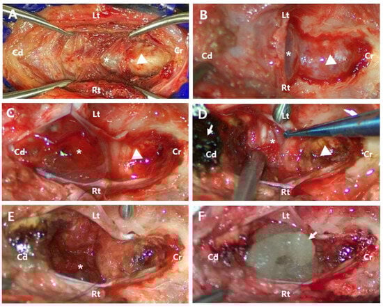 Perioperative images. (A) After separating the skin and muscle, the occipital bone (arrowhead) and C1 vertebra (asterisk) were exposed. (B) Following suboccipital craniotomy and partial dorsal laminectomy of C1, the tumor (asterisk) and cerebellar vermis (arrowhead) were covered by the dura mater. (C) After incising the dura mater, the dusky tan-to-pink color of abnormal tissue (asterisk) and the cerebellar vermis with a clear pink color (arrowhead) were exposed. (D) The tumor was infiltrative (asterisk), making it difficult to distinguish it from normal tissue. The cerebellar vermis was discolored (arrowhead) due to the application of absorbable oxidized regenerated cellulose (arrow). Absorbable oxidized regenerated cellulose with absorbed blood (arrow). (E) After partial tumor removal, remnants of the tumor (asterisk) were still observed. (F) The application of flowable thrombin material (arrow) for hemostasis after tumor resection. Cd, Caudal; Cr, Cranial; Lt, left; Rt, right.