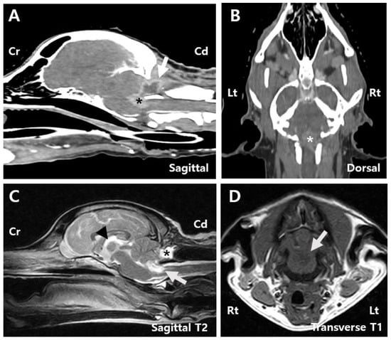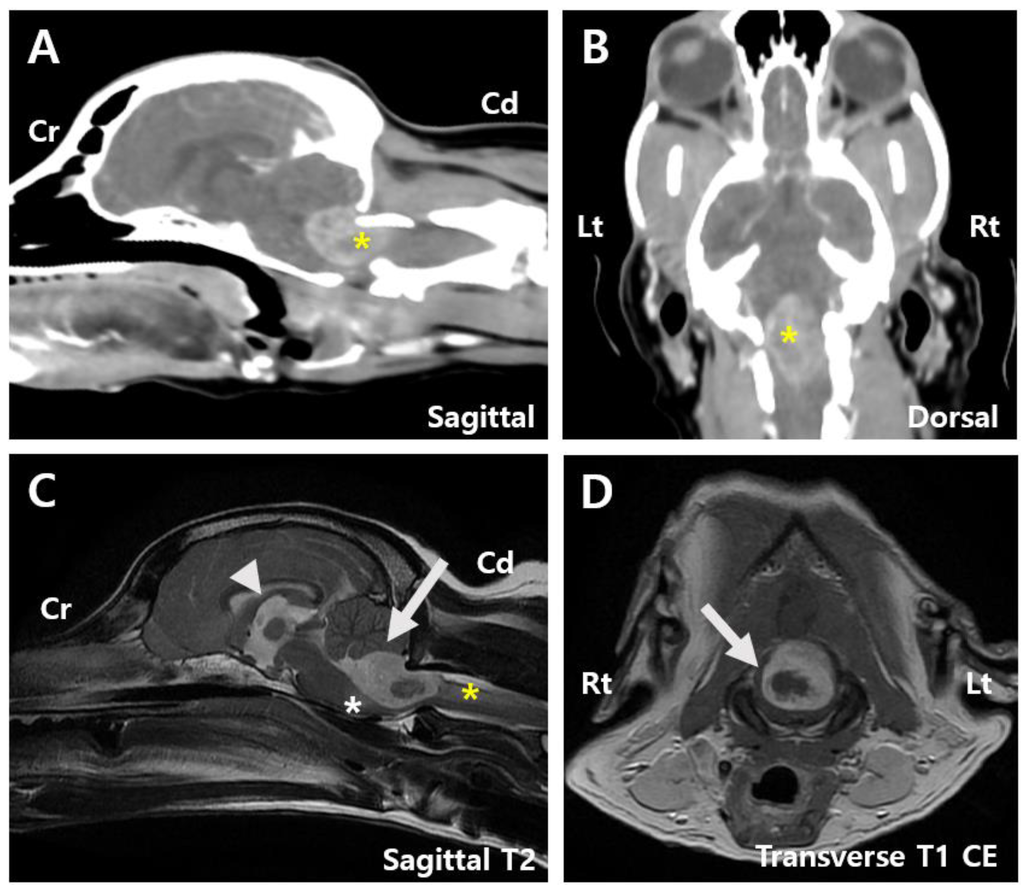 Pre-surgery images. (A) Sagittal computed tomography (CT) image of the patient showing a tumor measuring 1.4 cm × 2.2 cm (asterisk). (B) Dorsal CT image showing a tumor measuring 1.4 cm × 2.2 cm (asterisk). (C) Sagittal T2-weighted magnetic resonance imaging (MRI) image displaying mild dilation of the 3rd ventricle (arrowhead), compression of the cerebellum by the mass (arrow), and edematous changes extending to the adjacent brainstem (white asterisk) and C2 spinal cord (yellow asterisk). (D) Transverse T1-weighted contrast-enhancement magnetic resonance imaging (MRI) image suggesting a hematoma within the tumor (arrow). Cd, Caudal; CE, Contrast-enhancement; Cr, Cranial; Lt, left; Rt, right.