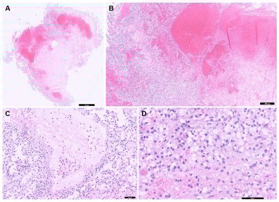 The excised tumor tissue was sent to a board-certified pathologist for histopathological analysis and additional immunohistochemistry (IHC) testing, including markers for cytokeratin AE1/AE3, vimentin, oligodendrocyte transcription factor 2 (Olig2), and glial fibrillary acidic protein (GFAP). Histopathological examination revealed that the tumor mass predominantly consisted of central hemorrhage with microvascular proliferation and necrosis surrounded by a relatively monomorphic proliferation of round to polygonal cells (Figure 4A,B). These neoplastic cells were arranged perpendicularly to necrotic regions, forming a pseudo-palisading pattern (Figure 4C). The cells exhibited variably distinct cell margins, pale, finely vacuolated to granular eosinophilic cytoplasm, and round to oval nuclei with finely stippled to dense chromatin and indistinct or occasionally prominent nucleoli (Figure 4D). Minimal anisokaryosis and low mitotic activity were also observed. A few numbers of hemosiderin-laden macrophages and polymorphonuclear cells were scattered throughout the tumor. This was likely due to a secondary inflammatory response associated with hemorrhage and necrosis. IHC results were as follows: cytokeratin AE1/AE3 showed negative immunoreactivity, vimentin demonstrated strong and diffuse cytoplasmic immunoreactivity, Olig2 showed variable nuclear immunoreactivity, and GFAP showed variable cytoplasmic immunoreactivity. Based on these findings, the tumor was classified as an undefined glioma, which is high grade due to extensive necrosis and microvascular proliferation. Additionally, the histological tumor assessment confirmed incomplete tumor excision.