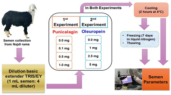 An ordinary small ruminant artificial vagina was used for semen collection. Semen samples were obtained from the rams 2 times per week for 6 consecutive weeks (12 replications). The collected semen was kept at 37 °C in a water bath. All samples were analyzed on site and only samples with at least 70% total motility were used. A computer-assisted semen analysis (CASA) system was used for assessing semen quality in the laboratory within 1 h of collection. Semen was assessed for quality measures including color, pH, ejaculate volume, percentage motility, total motility, viability, and concentration. Sperm quality parameters were evaluated using a computer-assisted semen analysis system (CASA: ISAS® program, Proiser R + D, Valencia, Spain). The experimental design of the current study is shown in Figure 1.