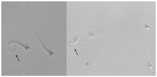 Assessments of plasma membrane functionality acrosome integrity and spermatozoon morphology were performed as follows: The hypo-osmotic swelling test (HOST) was carried out to assess the functionality of the sperm plasma membrane. The method of Fonseca et al. [30] was followed with minor modifications; briefly, this method is based on a fructose-based solution with 125 mOsmol at 37 °C (2 mL), to which 20 μL of the different semen samples were added. After incubation for 50 min in a water bath at the above-mentioned temperature, spermatozoa were checked to determine whether the sperm tail was coiled or not (Figure 2). Approximately 100 spermatozoa were assessed under phase-contrast microscopy with 400× magnification.