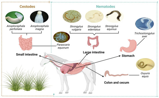 The most common parasites found in equines are gastrointestinal parasites such as cestodes Anoplocephala perfoliata and Anoplocephala magna, and nematodes, mainly Strongylus vulgaris, Strongylus edentatus, Strongylus equinus, Parascaris equorum, and Oxyuris equis, as shown in Figure 1. The most common symptoms of these parasites are colic, severe weight loss, and diarrhea [11,51].
