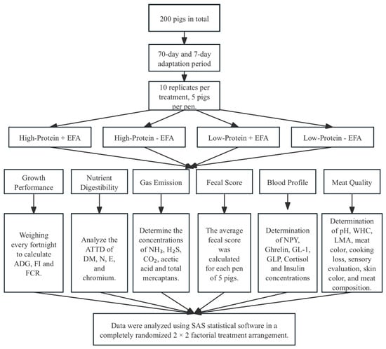Experimental flow design diagram. Abbreviation: EFA: eco-friendly additive; ADG: average daily gain; ADFI: average daily feed intake; FCR: feed conversion ratio; DM: dry matter; N: nitrogen; E: energy; NH3: ammonia; H2S: hydrogen sulfide; CO2: carbon dioxide; NPY: neuropeptide Y; GLP-1: Glucagon-Like Peptide-1; GIP: gastric inhibitory polypeptide; WHC: water holding-capacity; LMA: longissimus muscle area.