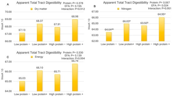 The effect of the addition of EFA to diets with varying protein levels on the apparent total tract digestibility of nutrients in finishing pigs. (A) Dry matter digestibility; (B) nitrogen digestibility; (C) energy digestibility; (−): 0% EFA; (+): add 0.5% EFA; a,b Means in the same row with different superscripts differ significantly (p < 0.05).