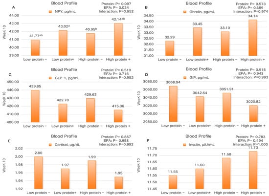 The effect of the addition of EFA to diets with varying protein levels on the blood profile in finishing pigs. (A) Neuropeptide Y; (B) Ghrelin; (C) Glucagon-Like Peptide-1; (D) gastric inhibitory polypeptide; (E) cortisol; (F) insulin; (−): 0% EFA; (+): add 0.5% EFA; a,b Means in the same row with different superscripts differ significantly (p < 0.05).