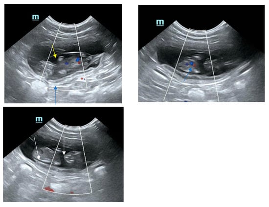 During the second half of pregnancy, the biparietal diameters becomes >15 mm. Detailed information on ultrasonographic biometry during fetal development are given in previous studies [5,62,63,66,67,68]. The uterine layers can be well differentiated; the serosa is a thin, hyperechoic outer rim, the echogenicity of the myometrium appears intermediate, hypoechoic to echoic, and the inner layer, the endometrium, appears as hypoechoic layer with multiple hyperechoic spots. The sonographical appearance of the placenta is dependent on developmental stage. Whereas in the embryo phase, the layers are more homogenous and difficult to differentiate, in the fetal phase, the thickening layer looks structured with increasing vascularization, with an inner and outer hyperechoic thin line and an inner hypoechoic line. The fetal membranes appear hypoechoic and become well visible after day 30 (yolk sac, amnion and allantois; see Figure 1). The thickness of the uterine wall ranged from 2.4 to 6.8 mm in one study [69]. Inner organs can be differentiated from day 30 on; the layered structure of the intestine is visible late, between days 52 and 56 [65,70].