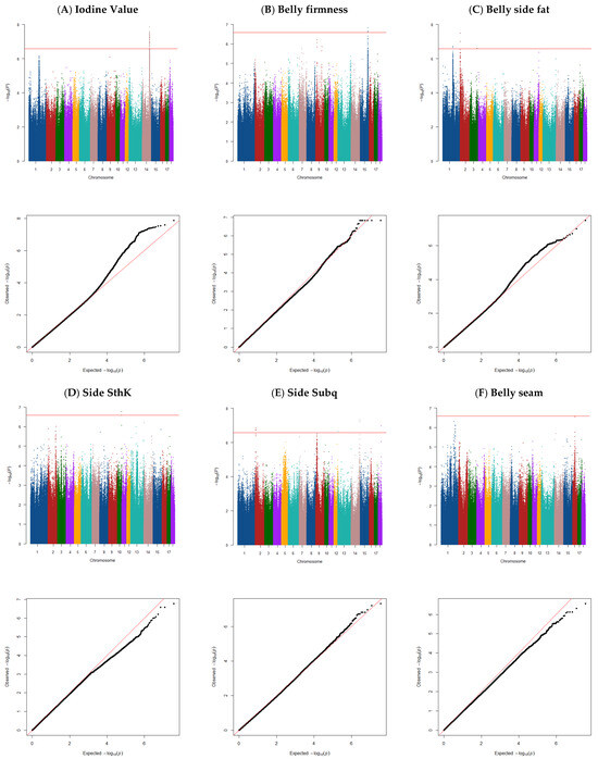 Manhattan and QQ plot of the GWAS for belly traits: (A) iodine value (λ = 0.97), (B) belly firmness (λ = 0.98), (C) belly side fat (λ = 0.96), (D) side SthK (λ = 0.96), (E) side Subq (λ = 0.94), and (F) belly seam (λ = 0.96) in commercial pigs. The horizontal red line indicates the genome-wide significance threshold (a significant threshold of p < 2.62410715 × 10−7, corrected for multiple testing). We applied the corrected threshold for multiple testing using the simple method described by Gao et al. (2008) [25].