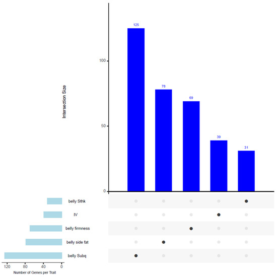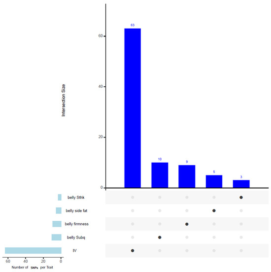 All the SNPs are included in Supplementary File S2. Figure 3 illustrates an upset plot showing the overlapping genes shared among traits in our GWAS analysis. However, no common genes were identified among the traits presented in this figure.