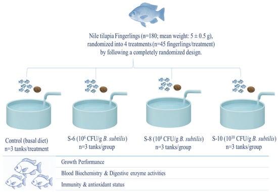 The dietary materials were purchased from the local market, and their composition and composite feed were assessed in accordance with Cunniff and Washington [] guidelines. The ingredients were passed through a 0.05 mm sieve (KENWOOD, AT284, Solihull, UK), batched according to the inclusion levels of the basal diet ingredients, and supplemented with the designated Bacillus subtilis (1 × 106, 1 × 108, and 1 × 1010 CFU g−1) levels. Each batch was then thoroughly mixed using a KENWOOD AT283 mixer (KENWOOD, Solihull, UK), moistened with water to form a dough, and pelleted using a meat mincer (ANEX, AG 3060, Karachi, Pakistan). Bacillus subtilis was applied post-pelleting using an oil coating, ensuring minimal heat damage. The viability loss was less than 10%, as confirmed by CFU counts. The pelleted feeds were air-dried at room temperature and stored at 4 °C. To maintain probiotic viability, diets were freshly prepared weekly, and bacterial counts in the feed were assessed every three days using the plate count assay. The basal diet was formulated based on the nutrient requirements of Nile tilapia as per the Council []. If the concentration dropped below the desired level, freshly prepared probiotic feed was reapplied. Details of the dietary ingredient composition and chemical analysis are presented in Table 1. Moreover, the experimental design illustration is given in Figure 1.