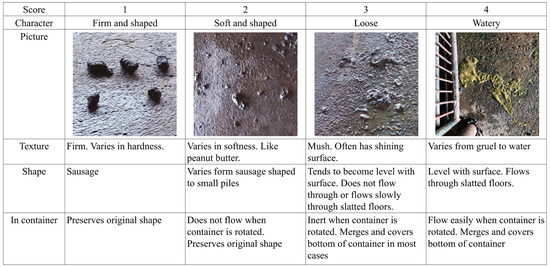 The 4 categories of fecal consistency score classification with descriptive text and pictures.