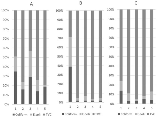 Fecal microbial proportions of coliform and E. coli and total viable count (TVC) in weaned pigs on D1 (A), D5 (B), and D10 (C). Pigs were fed a basal diet without ABO (T1), with 120 ppm of colistin (T2), or with 180, 240, or 360 ppm of halquinol (T3, T4, and T5, respectively).