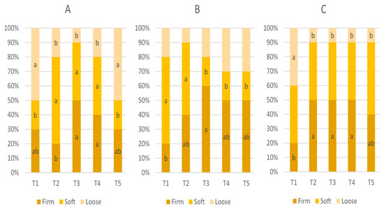 Proportions of fecal score classifications—firm, soft, and loose (represented by scores 1, 2 and 3, respectively)—for weaned pigs on D1 (A), D5 (B), and D10 (C). Pigs were fed a basal diet without ABO (T1), with 120 ppm of colistin (T2), or with 180, 240, or 360 ppm of halquinol (T3, T4, and T5, respectively). Letters inside the bars (a, b) indicate statistical significance (p < 0.05) for the fecal characteristic among the five treatments.